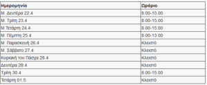 Από την Πέμπτη 02/05/19 θα ισχύει το κανονικό πρόγραμμα λειτουργίας Δευτέρα-Παρασκευή 08.00 – 20.00