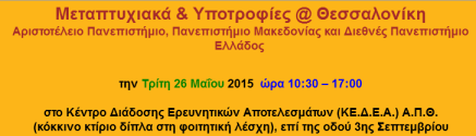 Την Τρίτη 26 Μαΐου 2015, τις ώρες 10:30-17:00, θα πραγματοποιηθεί έκθεση για να παρουσιαστούν τα Μεταπτυχιακά Προγράμματα σπουδών που προσφέρουν τα τρία Ανώτατα Εκπαιδευτικά Ιδρύματα της Θεσσαλονίκης, το Αριστοτέλειο Πανεπιστήμιο Θεσσαλονίκης, το Πανεπιστήμιο Μακεδονίας και το Διεθνές Πανεπιστήμιο της Ελλάδας.